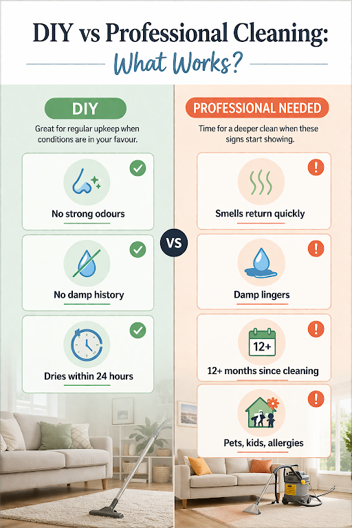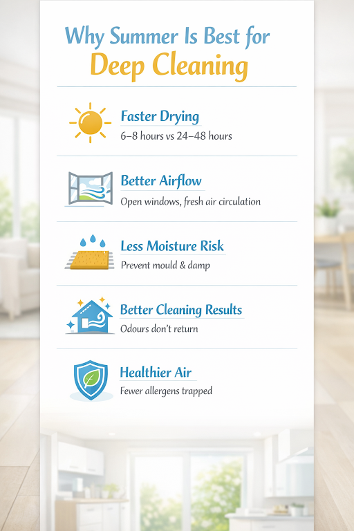 | What You’ll Learn (5 Key Takeaways) 1. Why timing matters more than effort Deep cleaning fails not because of poor technique, but because moisture doesn’t dry properly. You’ll understand how choosing the right season directly impacts results. 2. How summer conditions improve cleaning results You’ll learn how warmer temperatures, better airflow, and natural ventilation help your home dry faster and stay fresher longer. 3. The hidden signs your cleaning timing is wrong From damp carpets to recurring odours, you’ll be able to identify whether your current cleaning routine is actually working or silently failing. 4. Which areas of your home benefit the most Discover why carpets, upholstery, kitchens, and airflow zones see the biggest improvement when cleaned during summer. 5. When to choose DIY vs professional cleaning You’ll get clarity on when a DIY clean is enough and when professional cleaning becomes necessary for long-lasting results. |