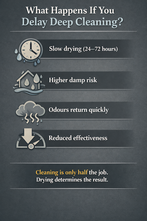 | How to know if timing is already causing problems? You don’t need to guess whether timing is affecting your cleaning results. Most homes show clear signs. Watch out for: 1. Carpets feel slightly damp hours after cleaning 2. A musty or “not quite fresh” smell returns within 24–48 hours 3. Rooms feel stuffy even after cleaning 4. The air feels heavier when the windows stay closed 5. More dust or irritation indoors Reality check: If your home never feels fully dry and fresh after cleaning, the issue is usually timing, not effort. |