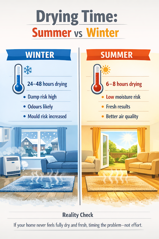 We’ve seen carpets cleaned in winter develop smells within days, not because of poor cleaning, but because they never dried properly.